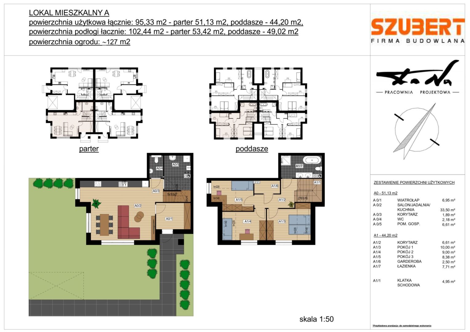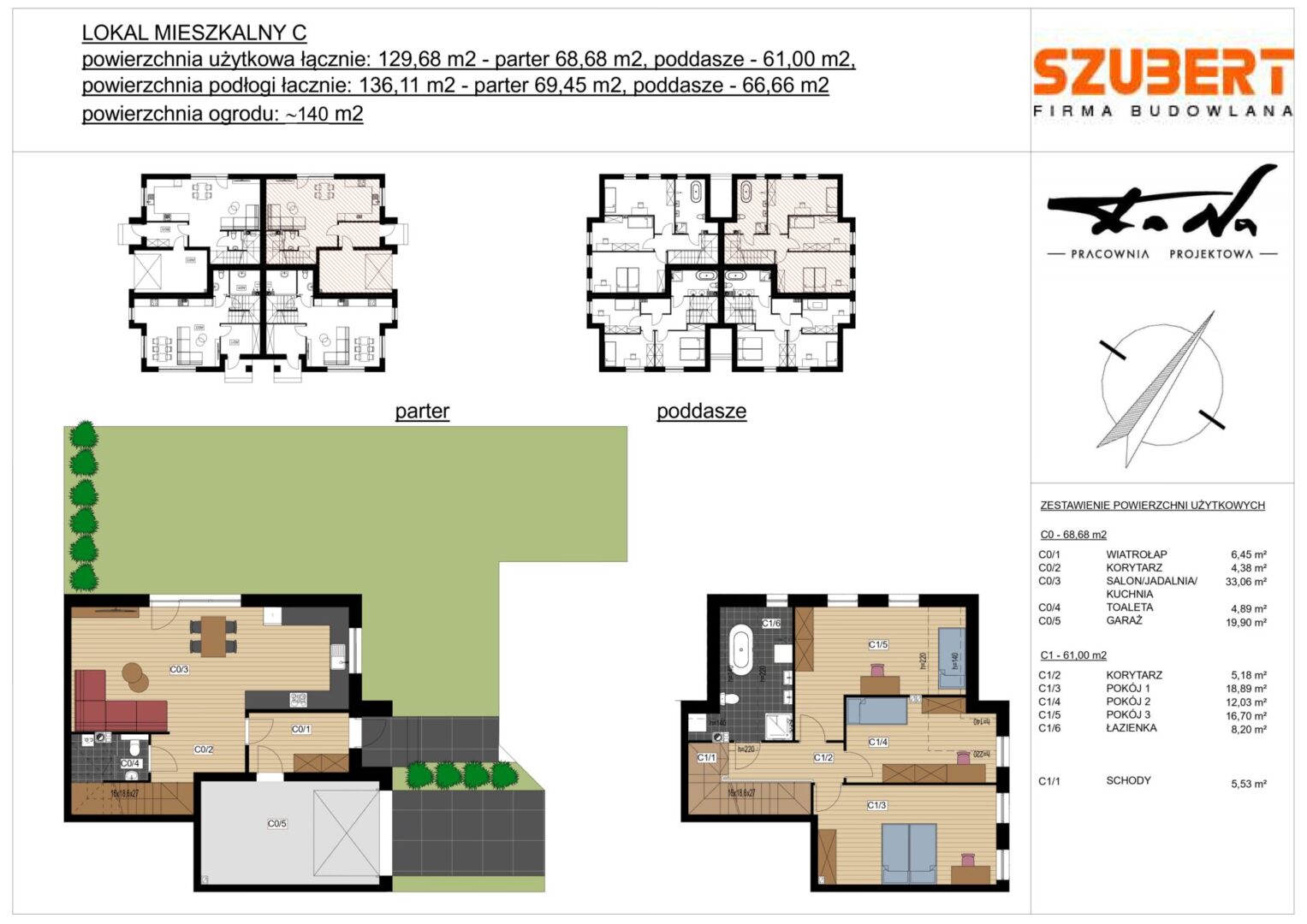 Segment z garażem o powierzchni użytkowej 129,68 m² w tym garaż 19,90 m² z ogródkiem ok 140 m². Segment bez garażu o powierzchni użytkowej 95,33 m² z ogródkiem ok 127 m².